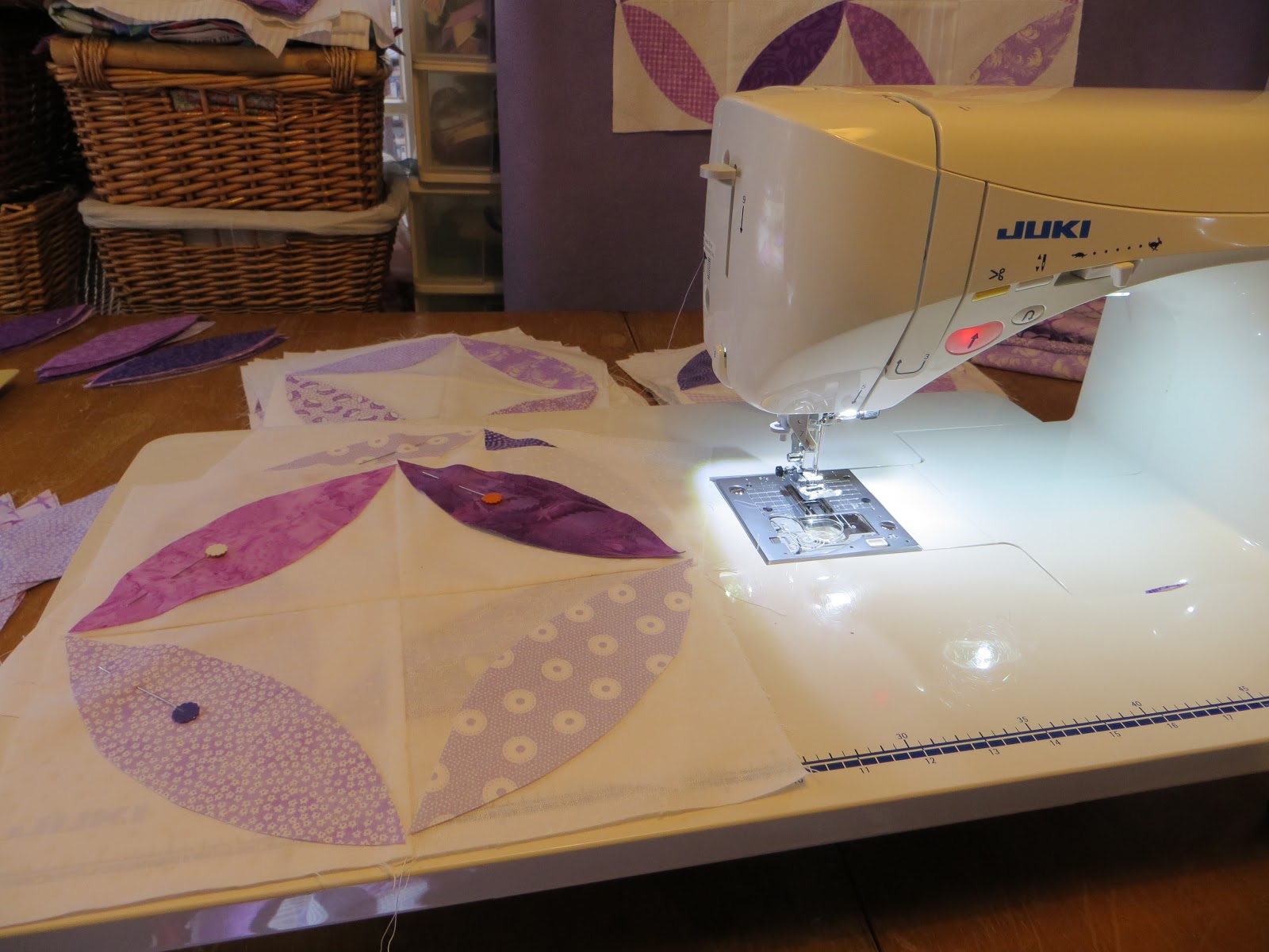 I pinned the 'petals' in place diagonally across the pieced squares.